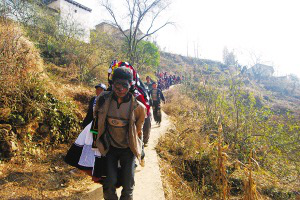 彝族新娘出嫁時(shí),雙腳是不能落地的,不然會(huì)被認(rèn)為不吉利。因此,彝族也就有了“背新娘”的習(xí)俗。