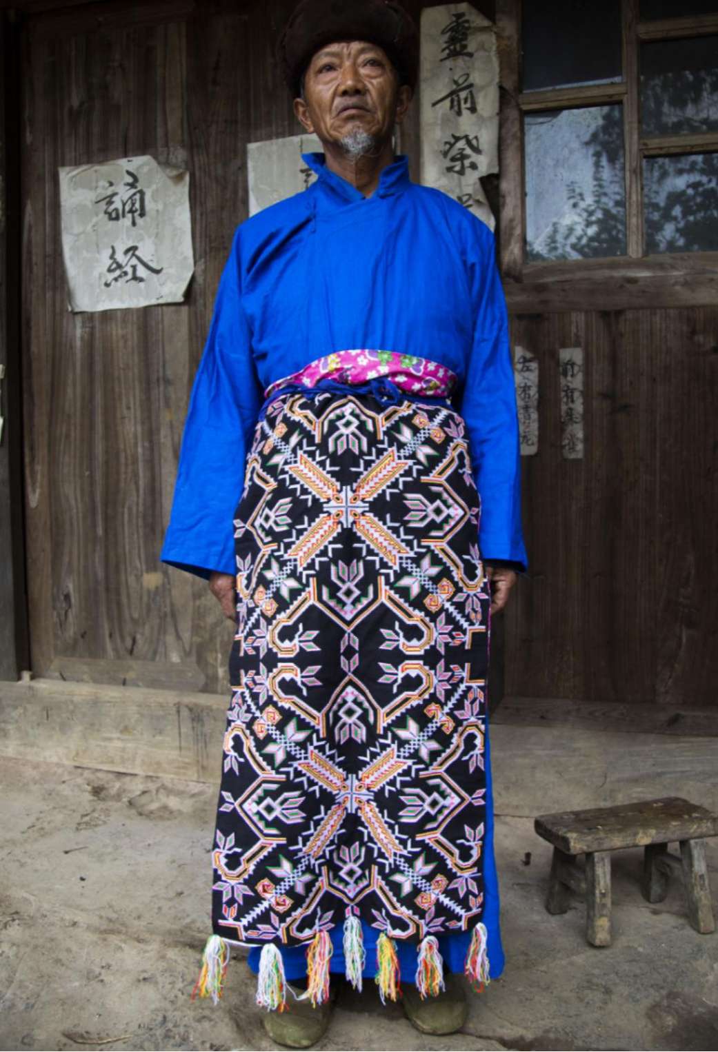 壩樓村苗族為花苗支,男子服飾比其他苗族支系的服飾更為艷麗,花紋圖案更多。男子服飾是一襲藍(lán)色的斜襟長衫,但在斜襟長衫腰部會(huì)系上長至腳踝的圍腰,圍腰以黑色為底色,上繡花紋和箭狀圖案,顏色以黃色為主。在圍腰下擺,連綴有絲縷。