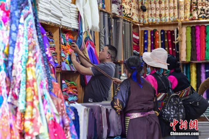 圖為7月24日,幾位藏族婦女在拉薩老城區(qū)八廓街上的藏裝店內(nèi)選購(gòu)藏裝。 中新社記者 貢嘎來松 攝