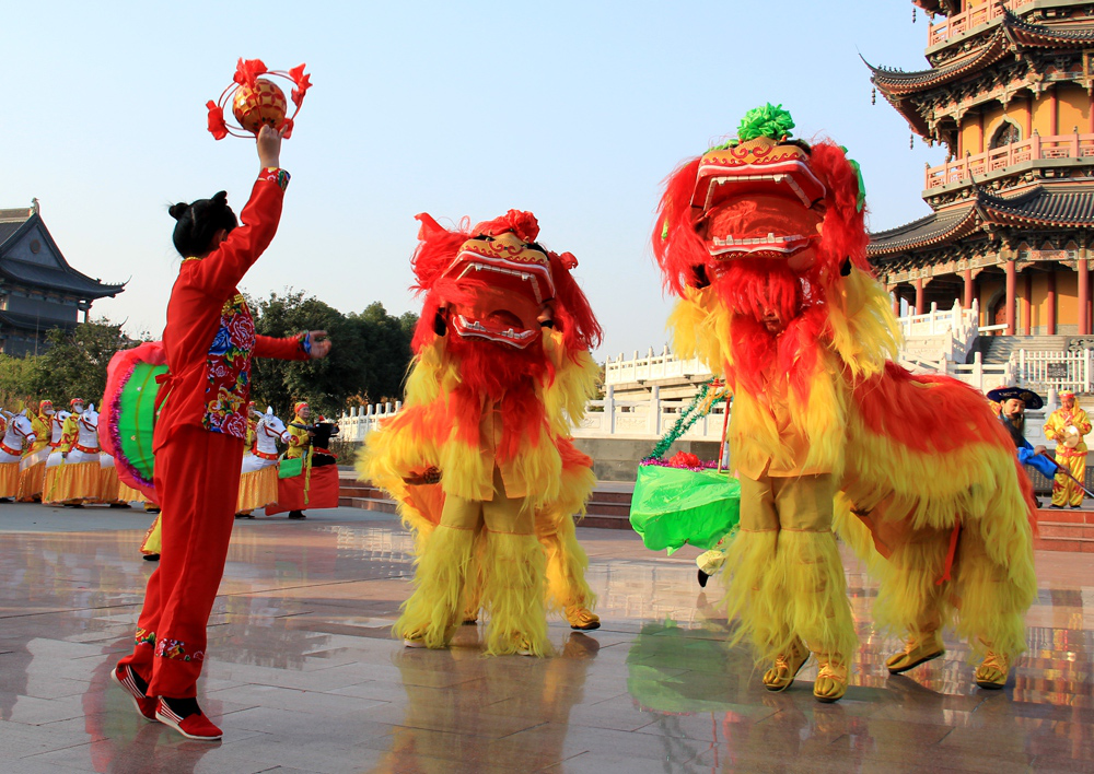 北獅一般是雌雄成對(duì)出現(xiàn);由裝扮成武士的主人前領(lǐng)。有時(shí)一對(duì)北獅會(huì)配一對(duì)小北獅,小獅戲弄大獅,大獅弄兒為樂(lè),盡顯天倫。北獅表演較為接近雜耍。配樂(lè)方面,以京鈸、京鑼、京鼓為主。
