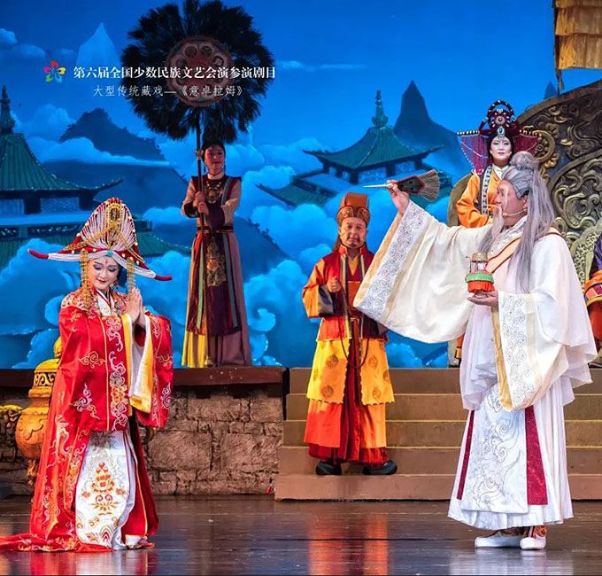 9月14日,作為第六屆全國少數民族文藝會演參演劇目,由青海省選送、青海省藏劇團(黃南藏族自治州民族歌舞劇團)創(chuàng)作演出的藏戲《意卓拉姆》在央視網和國家民委門戶網站進行演播。該劇講述了傳說中的仙女意卓拉姆與人間的諾桑王子相愛,歷經挫折與磨難后終成眷屬的愛情故事,表現出意卓拉姆對愛情的忠貞不渝和諾桑王子堅韌不拔的意志。