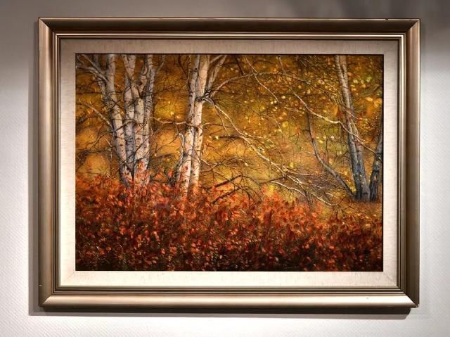 本作品表現(xiàn)的是深秋時(shí)節(jié)森林金黃,白樺樹落葉點(diǎn)點(diǎn)、露出白色枝干的景象。整體繡面用色豐富多彩,炫而不俗;針?lè)`活多變,層次鮮明,仿佛置身其間,給人以美的享受。