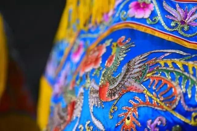 龍鳳褂裙,為女子出嫁與善終之時(shí)所穿之物。本作品采用精細(xì)金銀線配以潮繡墊高技法,繡制龍鳳圖案多達(dá)70余只,成為褂裙等級(jí)中的最高規(guī)格“褂王”。