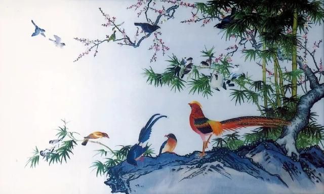 取材于古畫,采用蜀繡的運(yùn)針、輔針、切針、沙針、滾針、打籽針等針?lè)ɡC制。樹木花草層次分明、古樸自然,錦雞蝴蝶色彩艷麗。