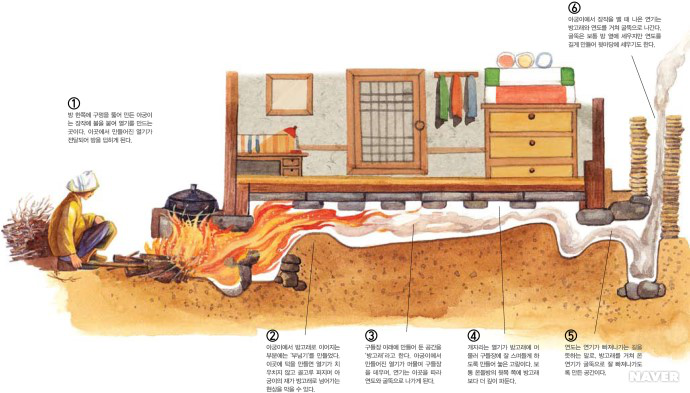 在傳統(tǒng)的朝鮮族民宅中,炕和鍋臺是平齊的,需要燒火做飯時,主婦會打開架在柜臺一側(cè)的移動木板,下到地面水平線以下的“灶坑”點(diǎn)火做飯。傳統(tǒng)的炕采用長筒式結(jié)構(gòu),煙火由一洞內(nèi)循環(huán)排出,使每洞都有煙火串入,炕即溫?zé)帷3r族的火坑高度為30-40厘米,但炕洞向下挖入,炕面抹白灰,表面糊油紙或鋪草簾子,炕面平整。隨著物質(zhì)條件的改善,炕面改鋪纖維板或者地板膠,既美觀又耐用。
