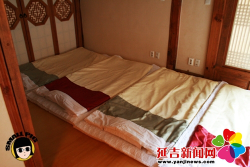 炕是朝鮮族家庭室內(nèi)活動的主要場所,吃飯時女主人會將食物都擺放在低矮的小餐桌上,搬到炕上全家人席炕而坐,盤腿圍坐一起吃飯。到了晚上,人們還是會在炕上鋪上被褥睡覺。因?yàn)榭皇且患胰酥匾幕顒訄龅?,所以勤勞干凈的朝鮮族婦女,每日清晨都會以“擦炕”開啟一天的勞動模式。