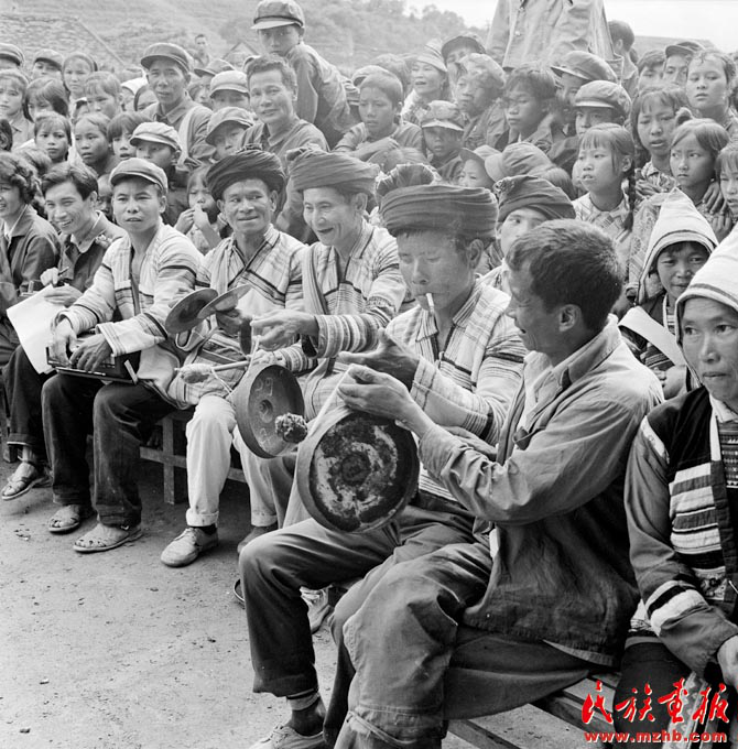 1979年,我國認(rèn)定基諾族為中國第56個(gè)民族,圖為基諾族群眾敲鑼打鼓歡慶的場景(中國民族圖片庫資料)