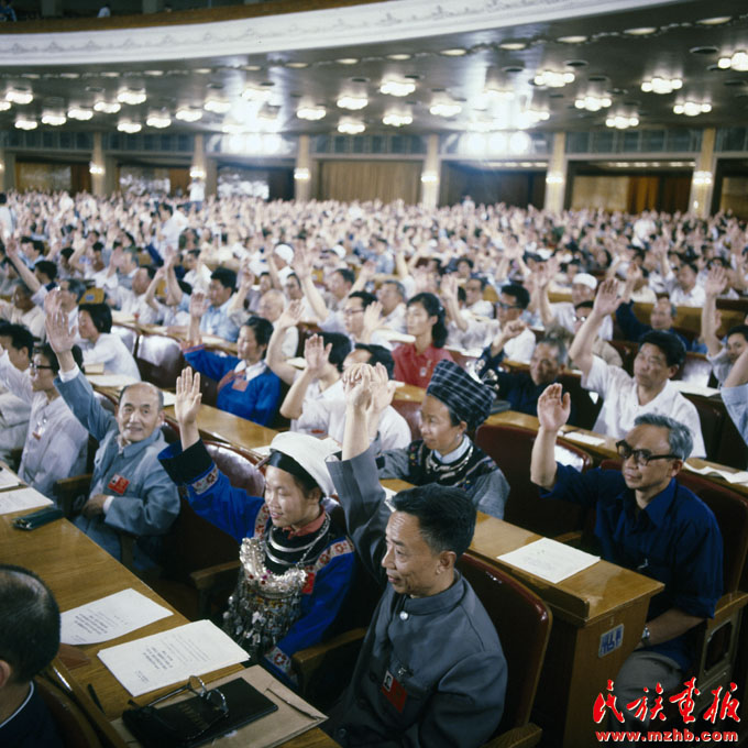1984年5月31日,中華人民共和國第六屆全國人民代表大會(huì)第二次會(huì)議通過了《中華人民共和國民族區(qū)域自治法》,自1984年10月1日起施行。民族區(qū)域自治制度是我國的一項(xiàng)基本政治制度。圖為各族代表舉手表決通過《中華人民共和國民族區(qū)域自治法》《民族畫報(bào)》2009年慶祝中華人民共和國成立60周年???/p>