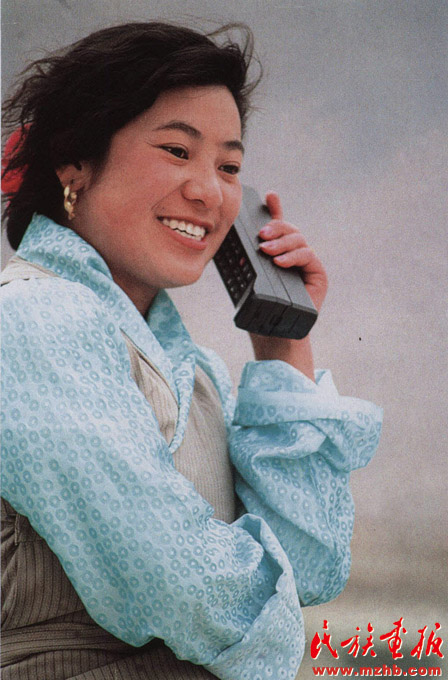 1995年,一位藏族婦女使用移動(dòng)電話聯(lián)系業(yè)務(wù)。這一年除青海省外,全國各省區(qū)都開通了移動(dòng)電話業(yè)務(wù),極大地方便了群眾的聯(lián)絡(luò)與溝通?!睹褡瀹媹?bào)》2008年第12期