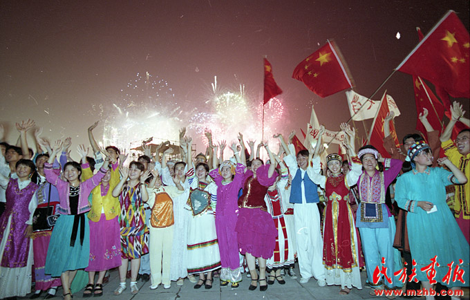 1997年7月1日零點(diǎn),中華人民共和國國旗和香港特別行政區(qū)區(qū)旗在香港升起,經(jīng)歷了百年滄桑的香港回到祖國的懷抱,中國政府開始對(duì)香港恢復(fù)行使主權(quán)。香港回歸祖國,舉國上下一片歡騰。各族人民以隆重而熱烈的方式,歡呼五星紅旗在香港特別行政區(qū)高高飄揚(yáng)。圖為首都各民族學(xué)生熱烈慶祝香港回歸。《民族畫報(bào)》1997年第9期