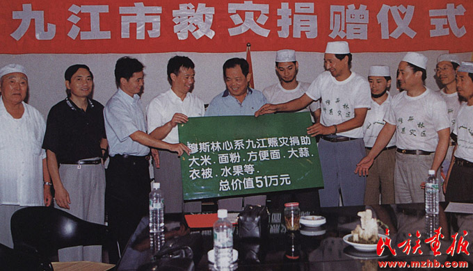 1998年,長江發(fā)生了全流域的特大洪水,災(zāi)情牽動(dòng)著全國各族人民的心,舉國掀起了“情系災(zāi)區(qū)、奉獻(xiàn)愛心”的賑災(zāi)熱潮。圖為回族企業(yè)代表在江西省九江市政府舉行捐贈(zèng)儀式。《民族畫報(bào)》1998年第12期