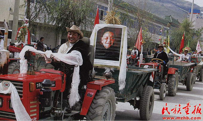 2004年8月21日,西藏山南地區(qū)乃東縣的農(nóng)牧民高懸鄧小平畫像,開著拖拉機(jī)在山南街頭巡游,表達(dá)對(duì)改革開放總設(shè)計(jì)師鄧小平同志的深切緬懷。改革開放后,西藏自治區(qū)農(nóng)牧民的年人均收入已從改革開放初期的幾百元上升至2004年的2000元左右,西藏城鎮(zhèn)居民年收入則超過7000元,位居西部前列?!睹褡瀹媹?bào)》2008年第12期