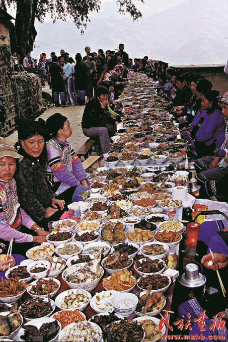 經(jīng)過近30年的改革開放,各族人民的生活發(fā)生了翻天覆地的變化。圖為2005年哈尼族在年節(jié)時(shí)擺的長街宴,席間有許多民族特色佳肴。最長的云南紅河州綠春縣的長街宴在2004年被載入世界吉尼斯紀(jì)錄《民族畫報(bào)》2005年第2期
