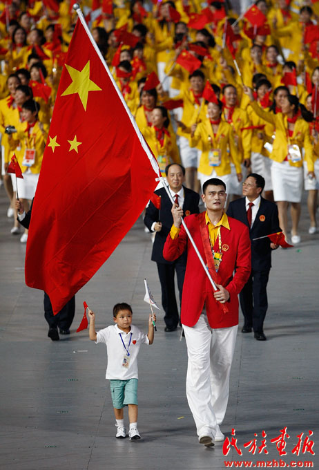 2008年8月8日,全國各族人民期盼已久的第二十九屆奧林匹克運(yùn)動(dòng)會(huì)在北京隆重開幕,圖為北京奧運(yùn)會(huì)中國代表團(tuán)入場儀式上,運(yùn)動(dòng)員姚明領(lǐng)著汶川大地震中最小的救人英雄林浩入場?!睹褡瀹媹?bào)》2008年第9期