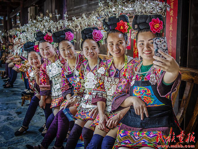 經(jīng)歷改革開放40年的發(fā)展,我國社會(huì)生產(chǎn)力、綜合國力、人民生活水平實(shí)現(xiàn)了歷史性跨越,全黨全國各族人民要更加緊密地團(tuán)結(jié)在以習(xí)近平同志為核心的黨中央周圍,高舉中國特色社會(huì)主義偉大旗幟,不忘初心,牢記使命,將改革開放進(jìn)行到底,不斷實(shí)現(xiàn)人民對(duì)美好生活的向往,在新時(shí)代創(chuàng)造中華民族新的更大奇跡。圖為貴州民眾盛裝自拍?!睹褡瀹媹?bào)》2018年第3期