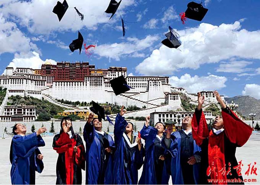 西藏已有普通本專科學(xué)校7所。西藏大學(xué)一批被授予博士、碩士學(xué)位的學(xué)生在布達(dá)拉宮廣場(chǎng)慶祝畢業(yè)