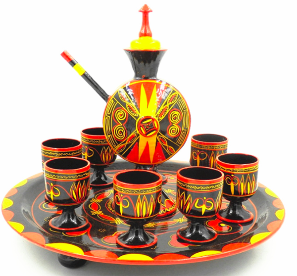 彝族漆器種類很多,僅餐飲具就有餐桌、飯盤、肉盤、湯缽、大小碗、勺、舀酒瓢等;酒具,有酒壺、酒杯等。民族風(fēng)格特別突出的是鷹爪杯、雁爪杯、牛角杯和野豬蹄杯等飲酒器皿。鷹、野豬等都是很兇猛的禽獸,用兇猛動物身上的材料做酒杯,標志著主人的靈巧與勇猛。他們認為戰(zhàn)勝了靈巧與兇猛的東西,其本身就更靈巧與勇猛。