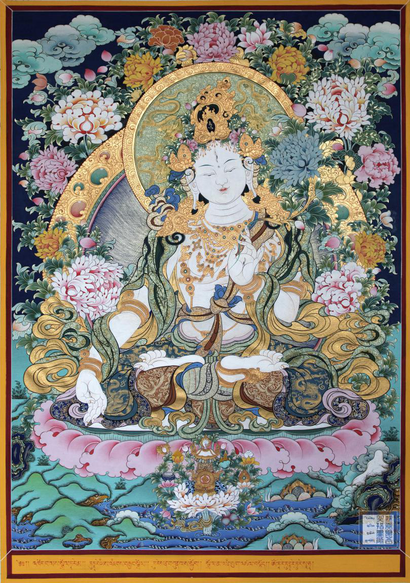 白度母,藏語(yǔ)稱“卓瑪嘎波”, 膚色潔白,玲瓏剔透,身放五光,溫靜微笑,相貌顯得青春年少,七只慧眼個(gè)個(gè)如菊花花瓣大小,這些眼象征她能觀照一切眾生。一面二臂,右手結(jié)施愿印,以示救助。左手拇指與無(wú)名指牽住白蓮花枝對(duì)著心間,花開至耳旁;美麗動(dòng)人,乳房隆起;以白珍珠為主的各種寶貝分別作為頭飾、耳飾、項(xiàng)飾、胸飾、腰飾、手鐲、腳釧;佩戴鈴串、天物之花;上穿白絲,下著錦裙;秀發(fā)后束,頂髻飄逸;月亮靠背,結(jié)金剛跏跌危坐。