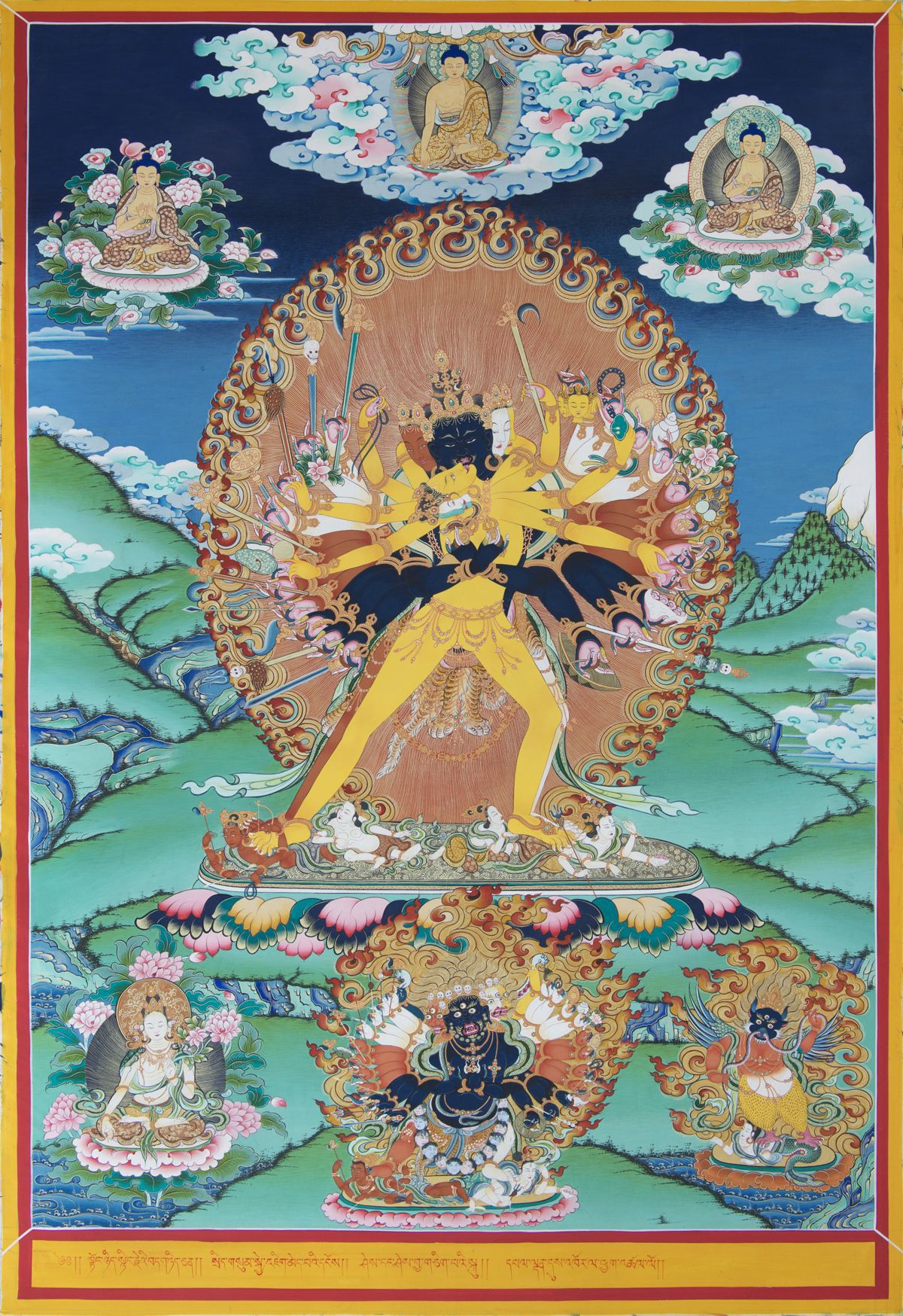 他的明妃呈黃色,四面八臂。四面顏色各異,手中持不同器物,伸左腿,曲右腿,與主尊相反。