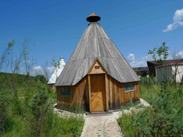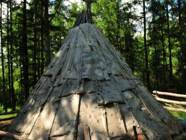 撮羅子的選址,是在地勢較高、陽光能照射到而且水和柴草就近可取的平坦之處。其蓋造方法,是用三五根約碗口粗細上有枝杈的木桿,相互交合搭成上聚下開的骨架,然后再用30根左右木桿搭在骨架之間捆綁固定,在南面(或東面)留出門,即基本成型。木桿搭起的只是“屋架”,外面還要覆蓋才能遮風擋雨。按照季節(jié)的不同,分別用樺樹皮、草簾子和犴、狍等獸皮,做成自上而下一層壓一層的圍子,綁在木桿上,門簾則夏用草或樹條編,冬用狍皮做成。