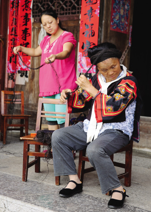 梳盛裝發(fā)型時(shí),需要用到假發(fā)、毛線等輔助工具來補(bǔ)充發(fā)量,才能令整個(gè)發(fā)型豐滿有型。雖說是假發(fā),也是用收集來的真發(fā)編制而成的。盤發(fā)過程中女兒王萬就在一旁協(xié)助母親。其實(shí)王萬這一輩人,已經(jīng)不會(huì)梳這種傳統(tǒng)的發(fā)型了。