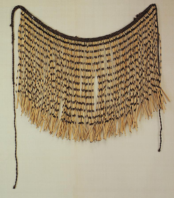 博嘎爾婦女穿一種叫“基都”的短上衣。用野麻織成的土布縫制,其樣式為無領(lǐng)、短袖、對(duì)襟。下部穿用羊毛織成的粗呢緊身筒裙,稱作“結(jié)邦”。小腿部扎裹腿,叫“涅蘇木”。條件好的人家外面還會(huì)罩一件稱為“階納布”的披肩。希蒙部落的婦女穿當(dāng)?shù)孛藁棾傻陌咨蛩{(lán)色的寬大對(duì)襟短上衣。下身穿筒裙,裙子下擺較寬,上面織有黃紅色或黃黑色的簡單圖案(圖為民國時(shí)期的珞巴族草裙,中央民族大學(xué)民族博物館館藏)。
