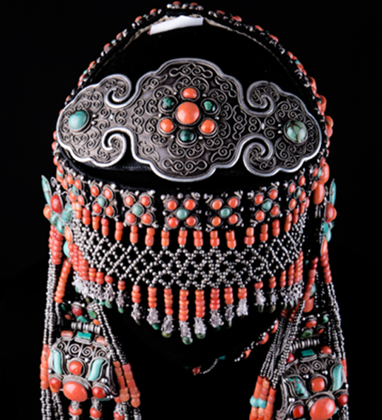 額頂飾:飾在頭箍之上, 形狀近似橢圓形,前部有四塊方形銀片,上掐絲嵌綠松石和珊瑚,其中最前部掐絲鑲紅珊瑚、綠松石拼成的蝴蝶型圖案, 銀掐絲工藝為托座。從整體來看銀絲捧紅花綠葉, 十分美麗。額頂飾兩端縫于青緞頭箍上, 居于整個頭飾的中心位置。