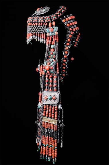 髻側流蘇飾:系于鬢角兩側,其上部銀飾造型從整體上看似飛翔狀蝴蝶,鑲嵌精美紅珊瑚珠、綠松石,造型熱情似火。蝴蝶銀飾之下垂系五條流蘇, 由紅珊瑚珠、綠松石珠及銀珠串間隔穿成五段,下墜蝴蝶型銀飾帽, 內銜桃形瑪瑙墜,流蘇在鬢角兩側隨頭的轉動而飄擺, 響聲清脆。