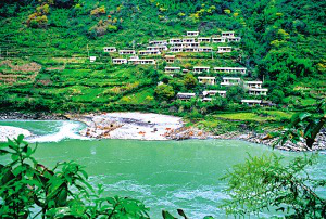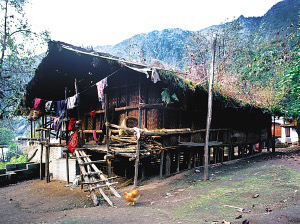 在怒江上游峽谷聚居的傈僳村寨都建在高山的半山上,其民居俗稱為“千腳落地房”。說“千腳落地”雖有些夸張,但也足以形象地說明峽谷溫?zé)岬臍夂蚝蜕礁咂露傅牡乩項(xiàng)l件。在雨季時(shí),“千腳”阻力最小,使山洪順利傾瀉而下,又很快干爽,免受潮氣。而且不需挖地動(dòng)土,不必移石砌墻,對(duì)木料沒有過高要求,長(zhǎng)短皆用,在生態(tài)脆弱的高山峽谷也算環(huán)保建筑。“千腳落地”是因建房時(shí)先在確定的屋基上依斜坡程度和住房面積打進(jìn)數(shù)十根到百余根木樁為基樁,以保證居室樓板的平正?;鶚洞蚝煤?,除四面留幾根高柱作為整個(gè)房屋的立柱外,在密集木樁所形成的平面上滿鋪竹篾編織的樓板,還有竹篾圍墻,所有結(jié)構(gòu)皆用竹篾綁扎。屋頂鋪苫草或蓋木片瓦,近幾年,已陸續(xù)換上了大塊的水泥波形瓦。房門開在山墻一側(cè),有廊道,可做曬臺(tái),平時(shí)穿的衣服都搭在這兒,也是婦女做針線活的地方。隨著怒江峽谷的開發(fā)和新農(nóng)村建設(shè)的深入,通路的村寨將很快會(huì)改變面貌。
