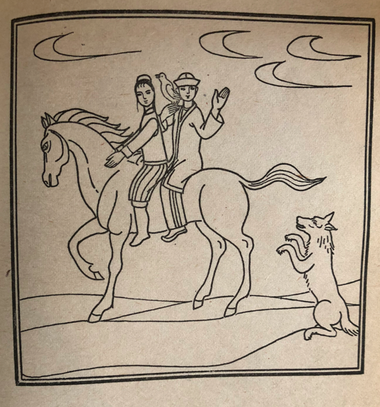 狼說了聲:“現(xiàn)在我該走啦。”轉(zhuǎn)身就走了。清晨,汗的姑娘讓四十個(gè)侍女領(lǐng)先,又讓四十個(gè)侍女隨后,她領(lǐng)著她們正要外出游逛去。狼藏在樹林后邊,上去一把把汗的姑娘拉住,很快地把她帶到了少年這里,讓讓他們倆一前一后地騎在自己背上,馱著他們飛馳而來。在路上,姑娘和這個(gè)少年彼此相愛了。少年向狼央求道:“現(xiàn)在我同這個(gè)姑娘已經(jīng)成了永遠(yuǎn)也不能分離的一對(duì)了??墒牵趺礃硬拍懿环蛛x呢?請(qǐng)你給我們想個(gè)辦法好吧?”
