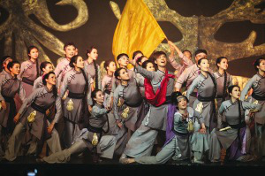 《遙遠(yuǎn)的察布查爾》以沈陽錫伯族同胞西遷新疆屯墾戍邊的史實(shí)為創(chuàng)作素材,融合了音樂、歌劇、舞蹈、雜技等多種藝術(shù)形式。全劇分為五大篇章。第一章《家鄉(xiāng)如天堂》,描繪了錫伯族在廣袤的呼倫貝爾大草原、豐饒的遼東大地建設(shè)自己的家園,他們狩獵、捕魚、耕作的生活景象;第二章《奉詔別鄉(xiāng)》,講述了錫伯族官兵奉清廷之命前往遙遠(yuǎn)的伊犁戍邊駐防,族人們用特有的薩滿爬刀梯的形式祈禱,祝福遠(yuǎn)行的親人一路平安;第三章《大西遷》,展現(xiàn)了艱辛的西遷路程;第四章《戈壁開大渠》,表現(xiàn)了堅(jiān)強(qiáng)的錫伯族人面對惡劣的自然環(huán)境,開掘大渠,引來滾流不息的生命之水;第五章《戍邊屯墾再創(chuàng)天堂》,講述了新疆錫伯族人不但在金戈鐵馬的歲月中保存了自己的文化,還將滿語、滿文完好地傳承至今,創(chuàng)造了一個個人間奇跡。