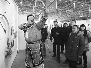 日前,在北京舉行的非遺生產(chǎn)性保護(hù)成果大展上,幾名觀眾圍攏在一個身材魁梧的錫伯族老人周圍,但見他身罩長袍,足踏薄底靴,雙目圓睜,兩臂運力搭弓上箭,儼然就是準(zhǔn)備步射的驍將。這位老人就是錫伯族傳統(tǒng)弓箭技藝傳承人伊春光,老漢手中的弓重近1公斤,是他親手制作的。