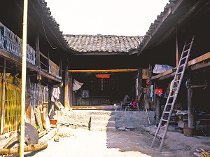 廚房大都在左間,地中間橫砌土臺鍋灶,上面是兩口大鐵鍋??亢髩κ谴毒摺⒉途?,前面是石碓,平時搗豬飼料,節(jié)日搗粑粑,用石碓搗的辣椒面也格外好吃。右間大都是家長的居室,只放木床。兩側(cè)廂房與主房分離,木板梯上下。一側(cè)下層是豬圈、牛欄,上邊存干草;另一側(cè)下面堆放糧食、燒柴、摩托車,上層是未婚子女的臥室,有廊道、腰欄。院落小的,在主房對面設(shè)牛欄,砌土坯墻圍成獨立的合院。