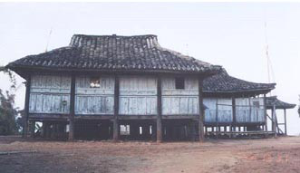 鎮(zhèn)康地區(qū)若干小家庭同住一幢房子,房?jī)?nèi)中間有寬敞的走道,兩旁為各小家庭住室,間壁而居,各有火塘,所以竹樓較大,有的占地近四百平方米。這種干欄式長方形大屋居住形式源于過去德昂族地區(qū)仍保留父系大家族社會(huì)組織,也就是說有血緣關(guān)系的后代都共同居住在一所大房子內(nèi),房屋的大小要依據(jù)家庭成員多少而定。雖然隨著社會(huì)的發(fā)展和大家庭生活方式的改變而瓦解消失,但在解放初期還能看到它們的遺址或縮小了的原型。