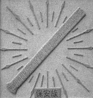保安族擅長(zhǎng)打刀技術(shù),所產(chǎn)刀具構(gòu)造精巧、質(zhì)量上乘,工藝獨(dú)成一體,被稱為“保安腰刀”。保安人打制腰刀具有800多年的歷史,公元13世紀(jì)成吉思汗東征時(shí),把部分來(lái)自中亞的官兵和工匠留在青海同仁地區(qū)。這部分色目人與當(dāng)?shù)孛晒?、漢、回、藏、土等民族相鄰而居,相互交流融合,逐步形成了今天的保安民族。保安族發(fā)揮擅長(zhǎng)冶鐵技術(shù)的特長(zhǎng),所生產(chǎn)的腰刀不僅自用,還成為與蒙古、藏、回等民族交換牛羊和日用品的商品,因此逐漸聞名于世。