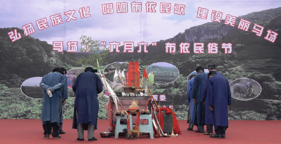 祭祀活動由寨老主持。牛頭、活雞等祭品供于案前,寨老穿著布依族的藍(lán)袍,誦頌著古老神秘的經(jīng)文,黝黑的臉上寫滿了對祖先、神靈的虔誠。而其他幾位德高望重的寨中老人,這時便協(xié)力殺了雞,人們用雞血淋紙旗插于火盆中,以火盆代替稻田,意為雄雞吃盡蝗蟲,糧食豐收,馬馱不盡。