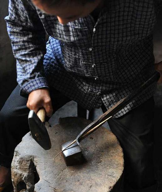錘打:將熱銀錘打成四方形長條或圓柱狀細(xì)條,再根據(jù)制作需要,做成片形或條形。