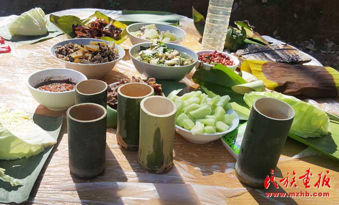 基諾族地區(qū)食材豐富,一日三餐,以大米為日常主食,雜以玉米、瓜豆等。每年5—9月的雨季,基諾山漫山遍野是食材,山藥、水芹菜、竹筍、魚腥草及各種菌類等無污染且很新鮮,是難得的烹飪材料,經(jīng)過簡單處理就成為餐桌上的美味佳肴?;Z族民間有句俗話,叫“漢炒、傣蘸、基諾舂”,也就是說漢族人喜歡吃炒菜,傣族的菜喜歡蘸著調(diào)料吃,基諾族的菜則以臼舂為主。基諾族的肉類的吃法較多,可以腌成干巴,也可吃新鮮的。酸腌魚、涼拌茶也是基諾族的最愛,基諾人做飯就餐均在竹樓二層的火塘周圍進(jìn)行,有一定的禮節(jié)和講究?;Z族吃飯時,主人首先要在火塘東側(cè)獻(xiàn)一點(diǎn)飯菜祭祀祖先和灶神,吃飯時全家人按順序在火塘旁圍蔑桌而坐,家長正對火塘,客人靠火塘而坐。