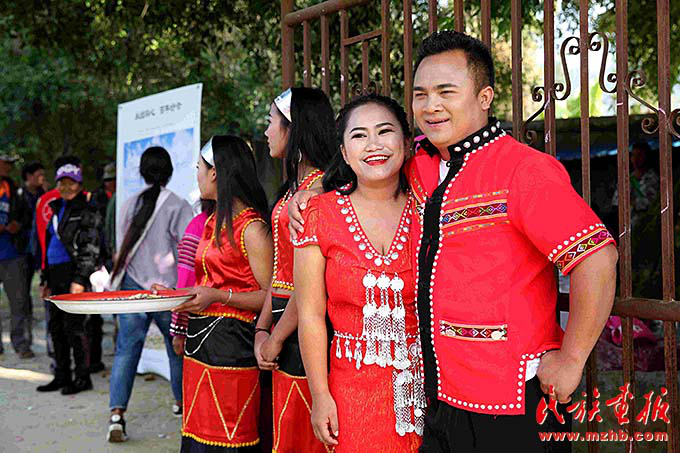 一對(duì)新人在雙方父母見證下,以佤族傳統(tǒng)婚禮方式喜結(jié)良緣