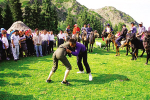 座談會結束后,大家又來到新地溝草原,舉行哈薩克族民間傳統(tǒng)體育活動,哈薩克族群眾紛紛參加姑娘追、摔跤、叼羊、賽馬等活動。一時間人聲鼎沸,歡歌笑語,草原上呈現(xiàn)出一片歡悅的景象。