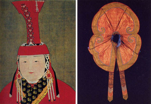 【圖為察必皇后(罟罟冠)與元代金絲(納石失)披肩,編者搜集】