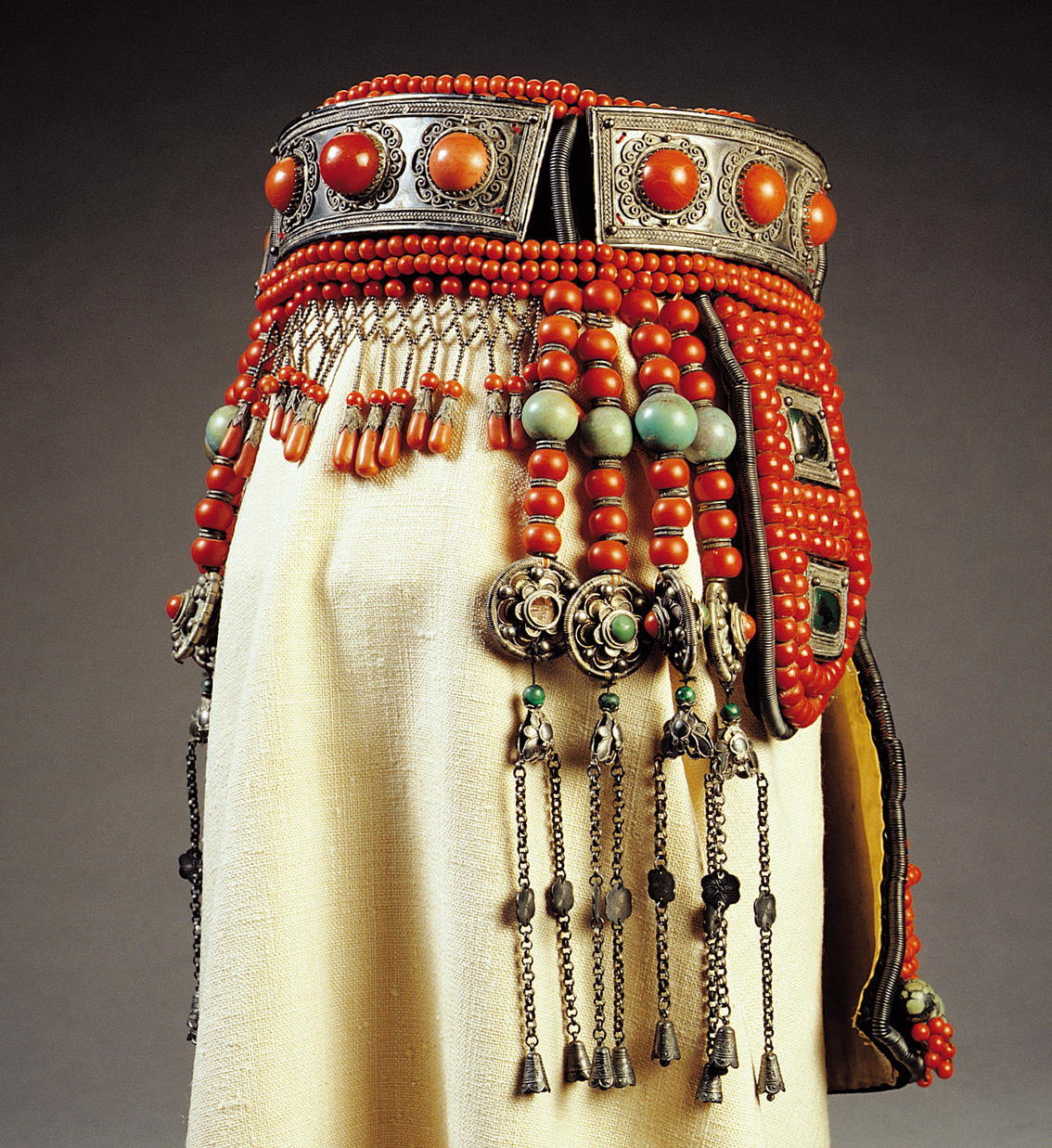 草原上,婦女們平時一般多罩頭巾。頭巾大約丈余長,顏色多種多樣。質(zhì)料有布、麻、綢、絹等。姑娘們喜歡將頭巾纏在頭上,然后在右側(cè)挽一個小結,把頭巾的穗頭垂下來。已婚婦女們則用頭巾包住頭頂后,纏一圈,不留穗頭。在莊重的場合還要戴上繡有丹鳳朝陽、二龍戲珠等花紋圖案的帽子。帽頂上有紅色穗子和閃光明亮的帽頂寶石。傳說這種習俗始于成吉思汗時期。當初成吉思汗統(tǒng)一蒙古各部落之后,下令每個人都要罩頭巾,以表示頭顱上飄有旌旗之角,希冀民族強大之精神常在。從結婚、告別姑娘生活的那天起,婦女們便開始佩戴雍容華貴的盛裝首飾。而蒙古族的盛裝頭飾,以鄂爾多斯地區(qū)最為典型。這種頭飾漢譯為“頭戴”,主要由“連垂”和“發(fā)套”兩部分組成。不僅制作工藝精湛,而且多用數(shù)百顆珊瑚、數(shù)十條銀鏈、珍珠串和許多銀環(huán)、銀片以及瑪瑙、玉石等穿綴而成。裝扮起來可謂珠簾垂面、琳瑯滿目。一副頭戴一般都重達三四斤,有的可達十余斤。據(jù)說一副高檔頭戴,過去往往要用幾群好馬或數(shù)百峰好駝才能換取。