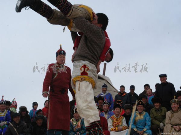 春節(jié),蒙古人稱為“白節(jié)”、“大年”,是蒙古人傳統(tǒng)節(jié)日,時間在農(nóng)歷正月初一。居住在農(nóng)村、城市、工礦區(qū)的蒙古族過春節(jié)的習俗同漢族差不多,但牧區(qū)有許多不同的特點。除夕之夜為“守歲”,合家老小席地坐在蒙古包中的矮桌周圍,桌上擺著一盤盤香噴噴的肉類、奶食品,以及糖果、香煙、美酒等物,有的還要在矮桌上供一張大紙,紙上寫著祖先的名字。午夜,開始飲酒吃年飯,或吃除夕餃子。按規(guī)矩團圓之宴要多吃多喝酒、肉,食器要擺滿滿一席。如吃不完也要剩得越多越好,象征新的一年里吃喝不盡、年年有余。家里的年輕人,要向長者敬“辭歲酒”。特別有意思的是全家共吃一塊由酥油、糖、白面烙成的大圓餅,這叫吃新年餅,每人只吃一口,意思是全家永不分離,永久團圓,永遠過甜甜蜜蜜的日子。除夕之夜要耍“嘎拉木”(玩羊骨頭)、說書、唱歌、跳舞,通宵達旦,熱鬧一宿。過大年,按習慣還要拜年,大年三十晚上為辭舊歲禮, 初一早上為迎新年,晚輩給父母和老人叩頭、敬酒、獻哈達,祝老人們身體健康,晚年幸福!老人擁抱孩子們,并斟上一碗鮮奶,祝愿子女們幸福,像牛奶一樣純潔。大年初一早餐后,男女盛裝,三五成群來到浩特(村鎮(zhèn)),挨家串戶給親友拜年??腿诉M屋首先向長輩叩頭拜年,祝愿老人身體健康,年豐人壽。按習慣由主人家的女婿向客人逐個敬酒,每敬必喝,或邊喝邊唱,邊唱邊舞。