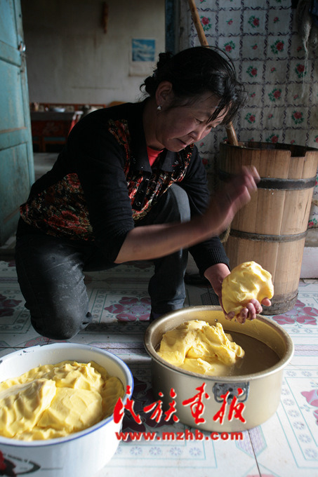 經過反復搗動、分離而制成酥油,并將其保存在牦牛胃制成的口袋里
