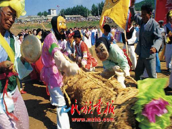 拔河是每年的農(nóng)歷正月十五舉行,最早多在民族運動會上進行,以自然村為一個參賽單位,同臨近的村進行比賽。首先要準(zhǔn)備拔河繩,繩有雄繩和雌繩之分,用稻草和藤條搓成。拔河繩有20?30厘米粗,長30?40米,由雄繩和雌繩兩股繩組成,然后進行拔河比賽,雌繩獲勝說明當(dāng)年農(nóng)業(yè)大豐收,因此雄繩有時會故意輸給雌繩?!?/p>