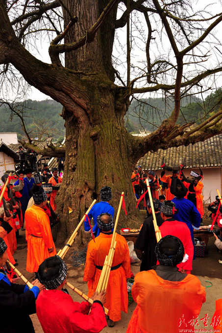 鼓師帶領(lǐng)族人在村口祭牛神