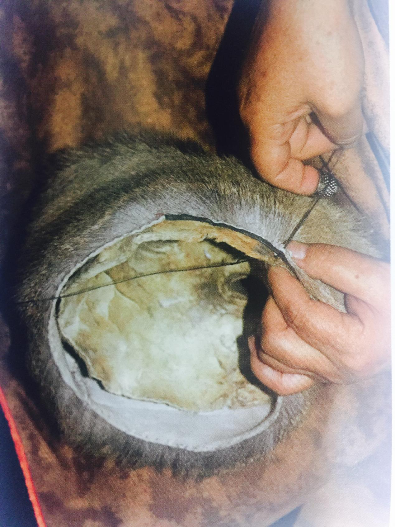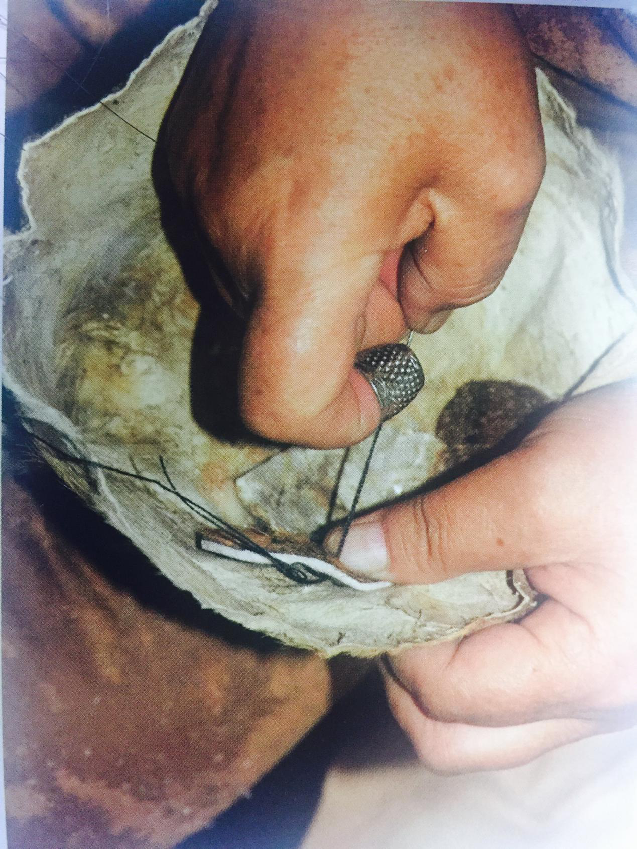 狍角帽是用整狍子的頭顱,去掉骨肉后,保留狍頭上的毛、角、耳朵、鼻子和口,精心鞣制而成。主要制作流程是:剝皮,清洗、熟皮,定型,補眼睛、刺繡、制作繡片,縫合護耳與頭皮,制作里襯。制作時,如何剝得完整的頭皮,是整個制作環(huán)節(jié)的關(guān)鍵。
