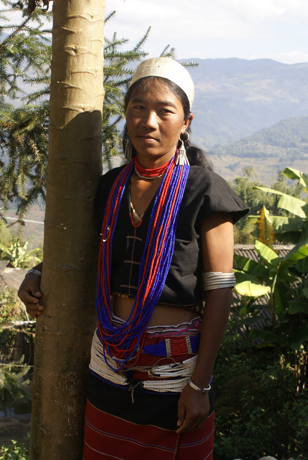 而婦女們的裝束特點(diǎn)分明與眾不同。最突出的是頭戴寬約3公分左右的銀箍,留長發(fā);身著靛青色無領(lǐng)大襟右衽及橫條花筒裙。腰系紅布寬腰帶和數(shù)十根細(xì)藤圈。耳掛垂肩圓形大耳環(huán),頸戴銀質(zhì)大項(xiàng)圈,細(xì)項(xiàng)鏈。上了年紀(jì)的人,喜歡戴長約五公分傘狀大耳筒,筒頂還刻有各種花紋。有的婦女在耳筒內(nèi)插上香花香草,有的放上人民幣,出門趕集,隨用隨取,很是便利(上下兩圖由劉軍供圖)。