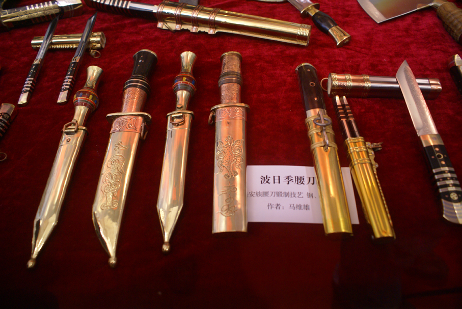 保安腰刀,是保安族的傳統(tǒng)工藝品,由于其打造技藝精悍,與新疆的英吉沙小刀、云南阿昌族的戶撒刀并稱為“中國少數(shù)民族三大名刀”,在中外都享有盛譽(yù)。保安腰刀品種繁多,有“什樣錦”、“雅五其”、“雙落”、“滿把”、“扁鞘”、“雙刀”、“細(xì)螺”、“波日季”、“哈薩刀”、“蒙古刀”等,刀面上刻 “七顆星”、“五朵梅”、“一條龍”、“一把手” 等圖案,這些圖案通常為鐵匠代號,即一看刀面團(tuán)就知道是哪位鐵匠所制,而有的圖案則是記載保安鐵匠的遭遇。保安腰刀中,最為漂亮的要數(shù)“什樣錦”,“波日季”則名氣最大。