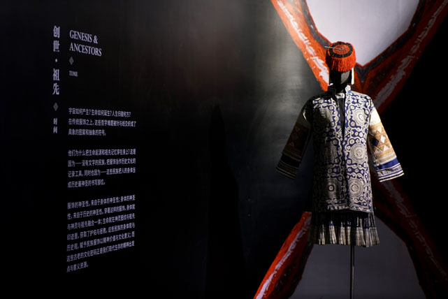 展覽呈現(xiàn)了在傳統(tǒng)服飾中,這些哲學(xué)難題被針與線在不同歷史時期交織成具象圖案和抽象符號——對于創(chuàng)世與祖先,對于人與神、天與地,傳統(tǒng)服飾成為苗、瑤、彝、侗等民族書寫與描摹的材料;服飾之上精美的紋飾,展現(xiàn)出這些民族心中神靈的形象,勾畫出民族英雄的事跡,從而建立起關(guān)于自我認(rèn)識的圖景,生發(fā)出對宇宙的敬畏。
